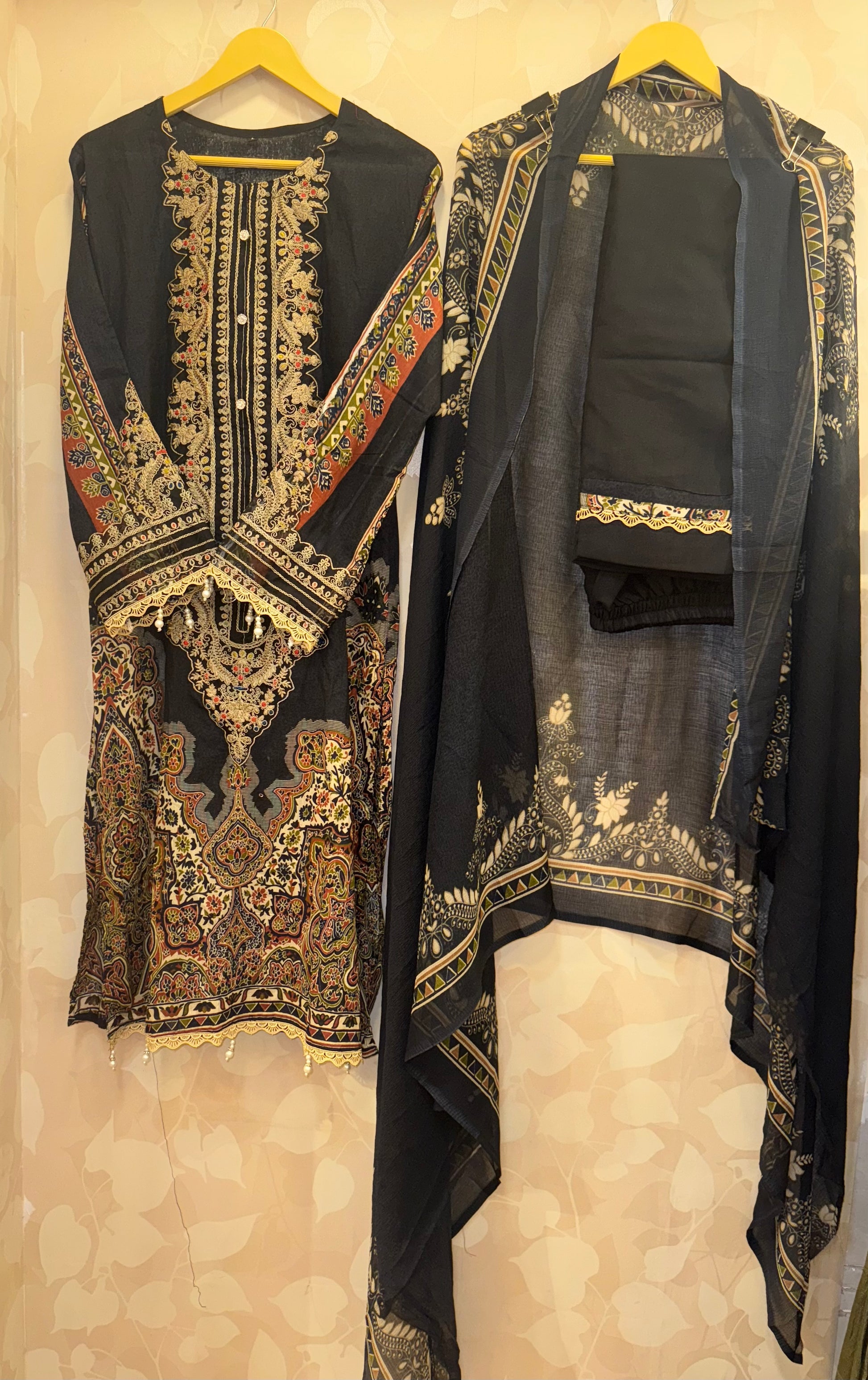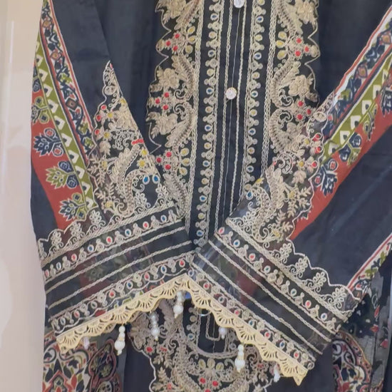 Embrace classic elegance with this Black Pakistani-Style 3-Piece Embroidered Suit from Inara by Javed & Daughters. Inspired by Maria B’s signature aesthetic, this ensemble features intricate multi-hued thread embroidery and fine patchwork, creating a stunning tapestry of traditional design.
