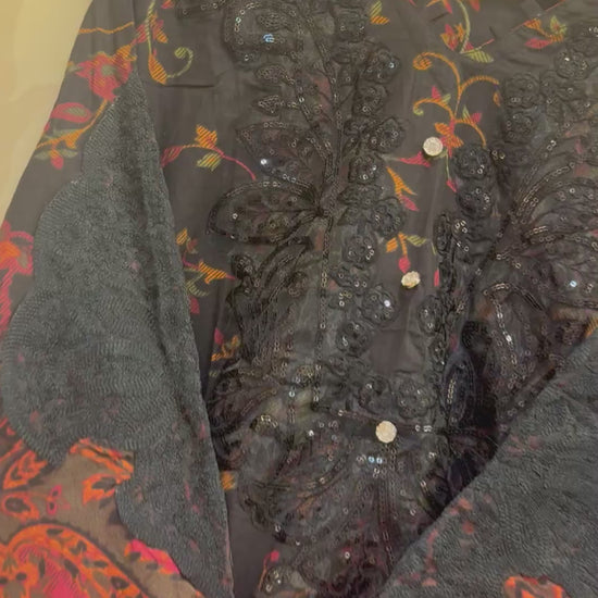 Inspired by the elegance of Durefishan, this Black and Red Pakistani-Style Lawn Suit from Inara by Javed & Daughters redefines understated glamour. The ensemble showcases delicate patchwork and intricate thread embroidery across the neckline and borders, bringing together tradition and sophistication in every stitch.