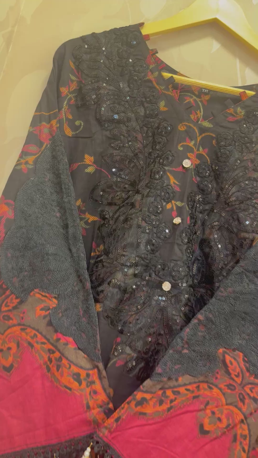 Crafted from premium lawn fabric, this 3-piece set is paired with a soft cotton dupatta for effortless comfort. The striking combination of black and red exudes regal charm, making it an ideal choice for festive occasions, Eid gatherings, or elegant daywear. A piece that captures the timeless beauty of Pakistani couture — refined, feminine, and graceful.