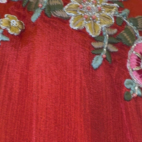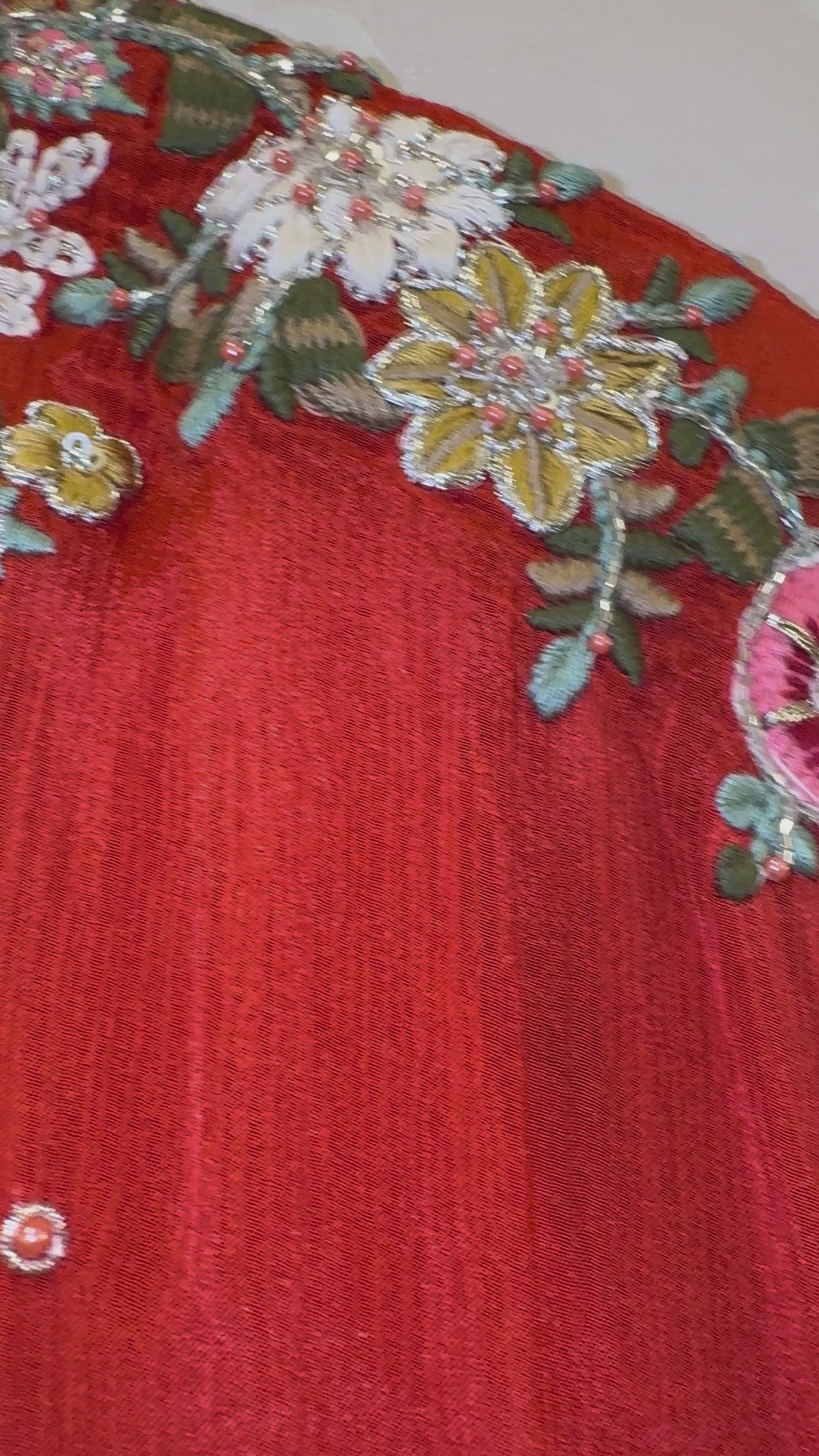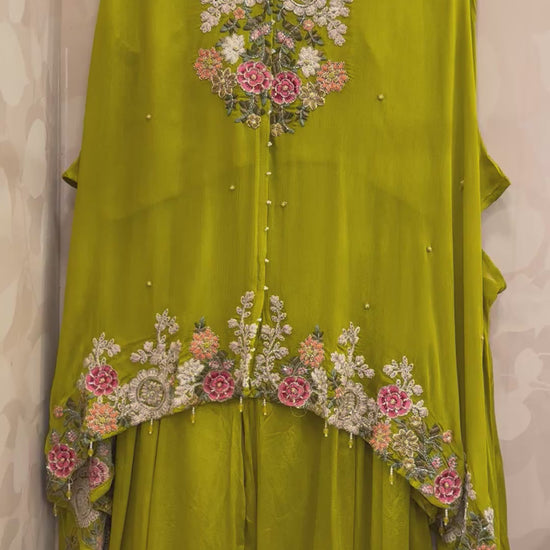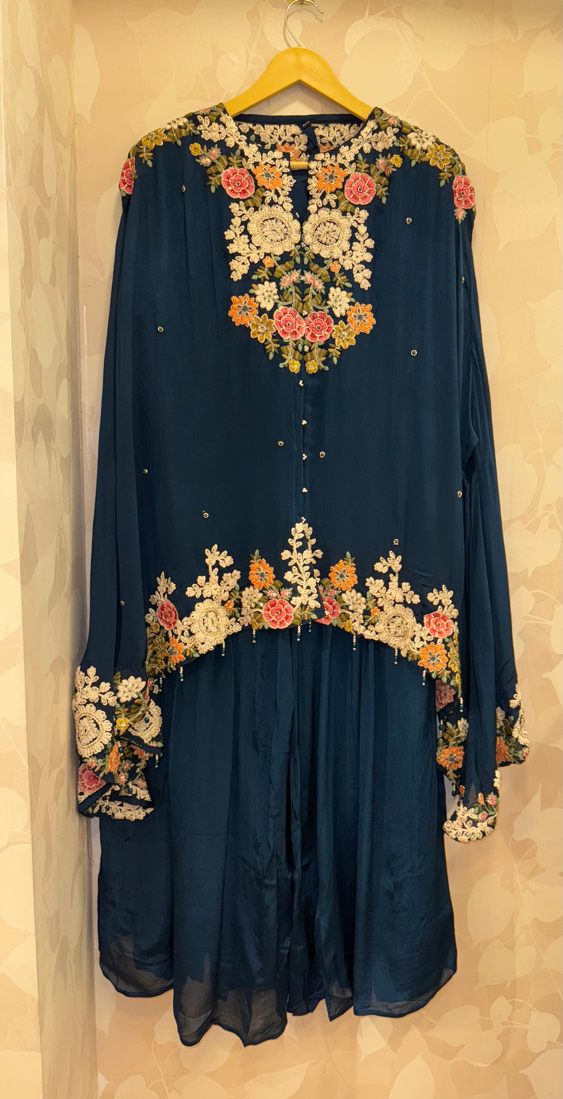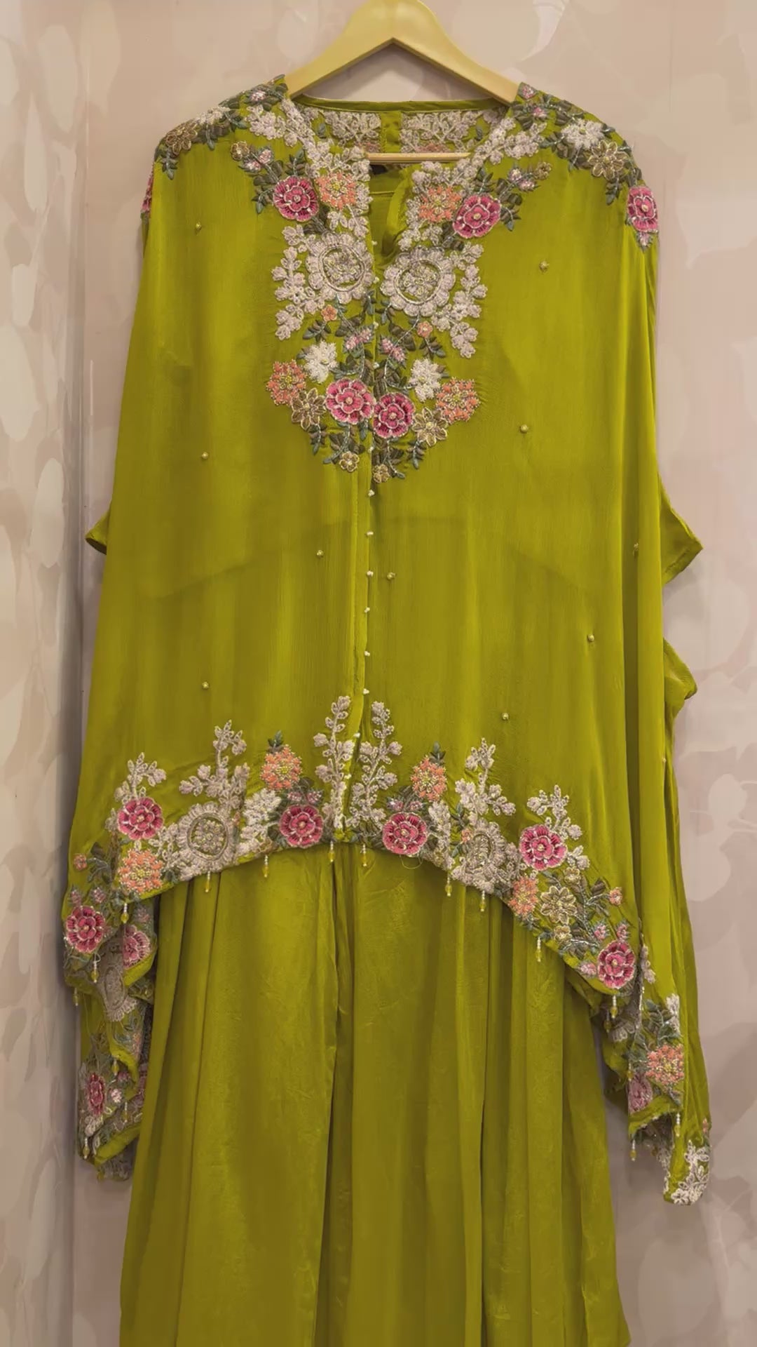 Step into effortless elegance with this kaftan-style kurta set, intricately adorned with multi-colored floral embroidery on the front, back, and sleeves. Crafted from soft, flowy fabric, the ensemble features a high-low hemline that adds modern flair while keeping it traditional at heart. Paired with coordinated palazzos, this outfit is the perfect blend of comfort and luxury, making it ideal for festive gatherings, wedding celebrations, or evening soirées.
