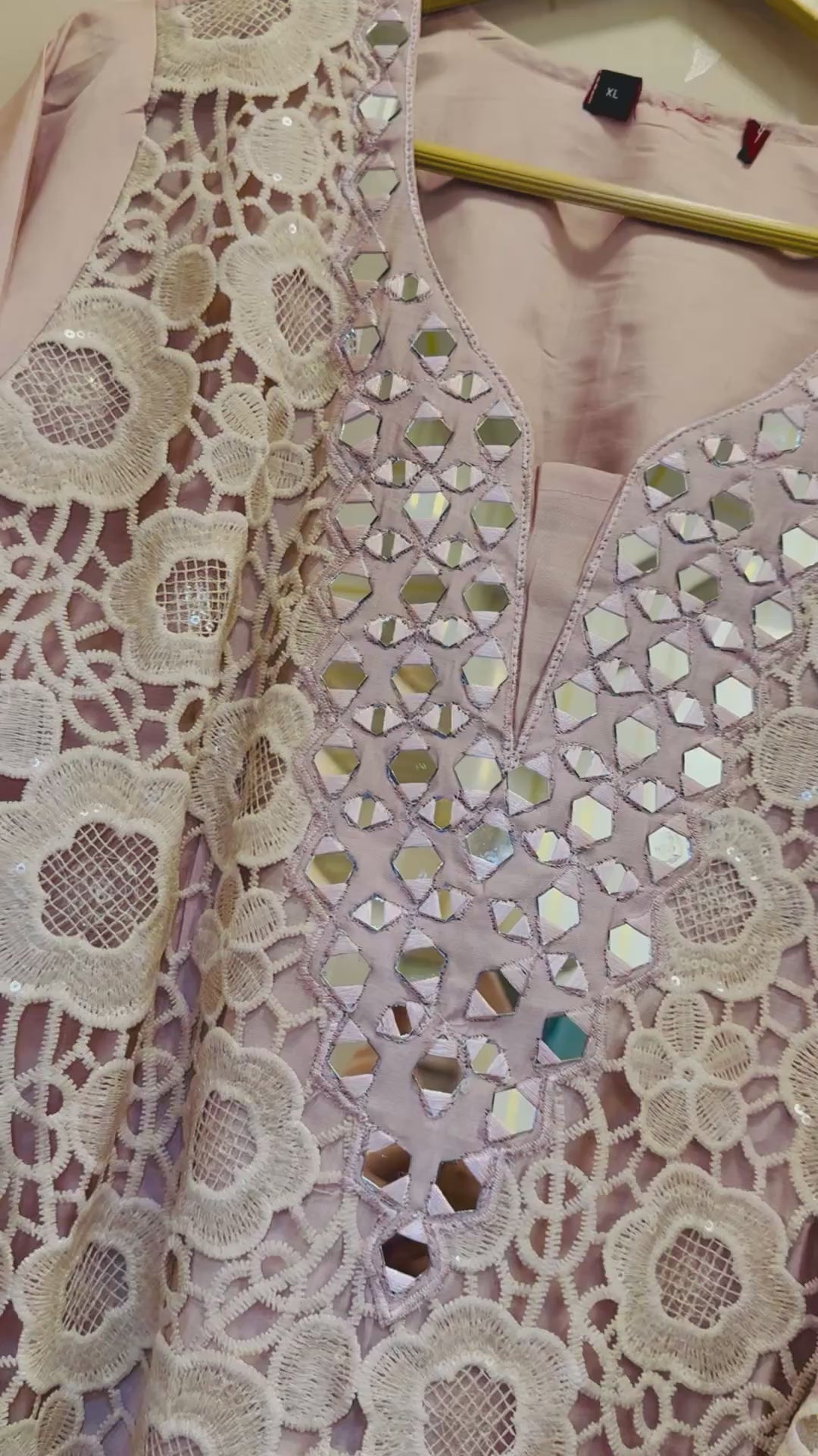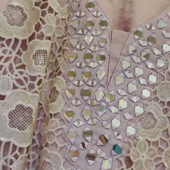 Step into effortless elegance with this peach crochet cutwork kurta set featuring a real mirror-embellished neckline. Crafted with intricate detailing and paired with matching pants and a soft organza printed dupatta, this 3-piece set is perfect for festive gatherings, brunches, and intimate occasions.
