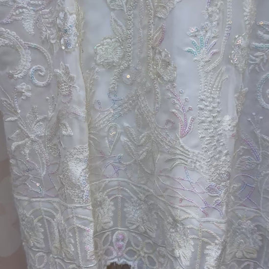An epitome of regal elegance, Zarqah reflects the timeless allure of authentic Pakistani craftsmanship. The rich cream base is adorned with stone, sequin, and pearl embellishments, featuring heavy handcrafted patches and delicate shimmer highlights that exude understated opulence. Paired with a pure chiffon dupatta and matching pants featuring coordinated detailing, this ensemble is the definition of festive sophistication.