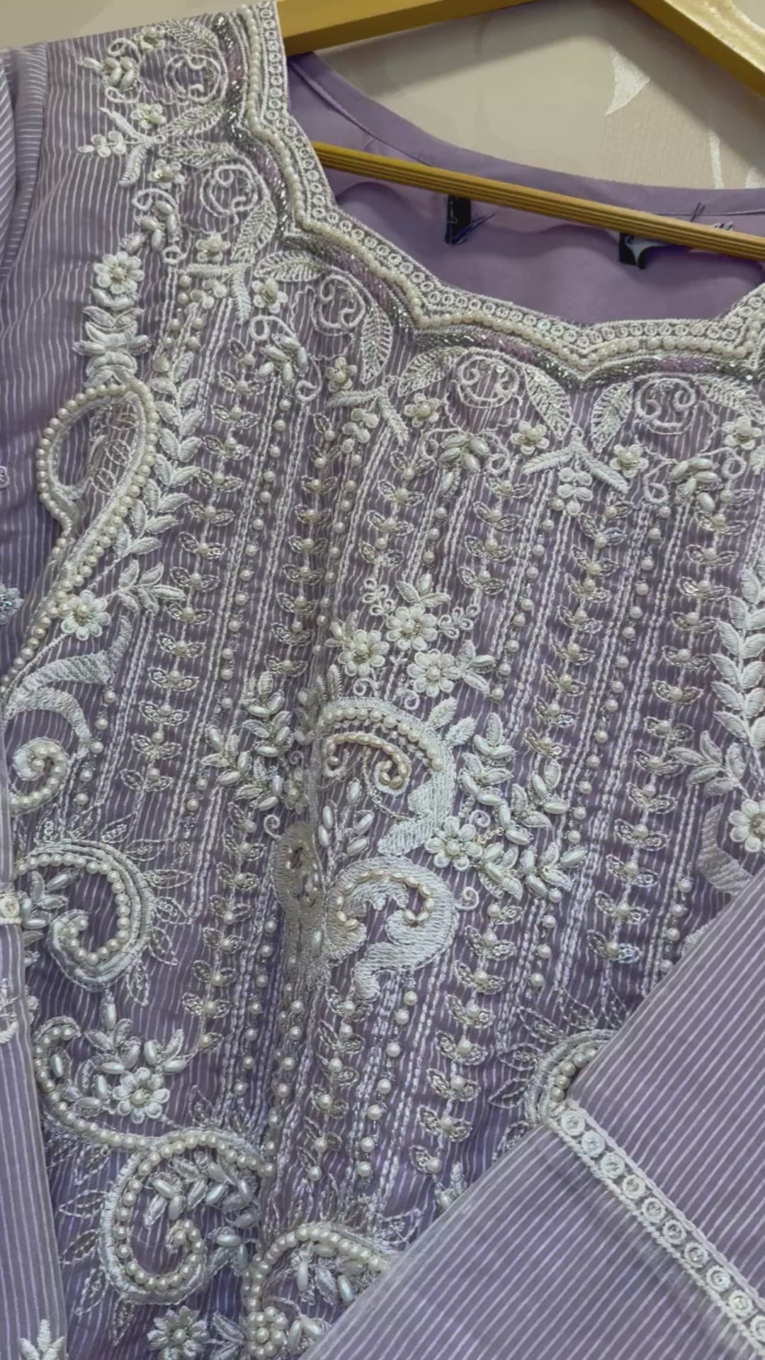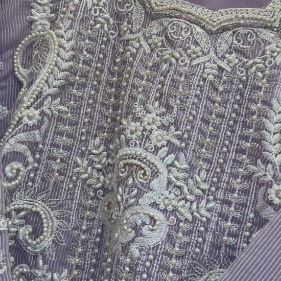 Elevate your festive style with this organza Pakistani-style suit featuring off-white embroidery and hand pearl detailing on the kurta and dupatta. Paired with straight pants, this elegant 3-piece set blends modern grace with traditional charm.