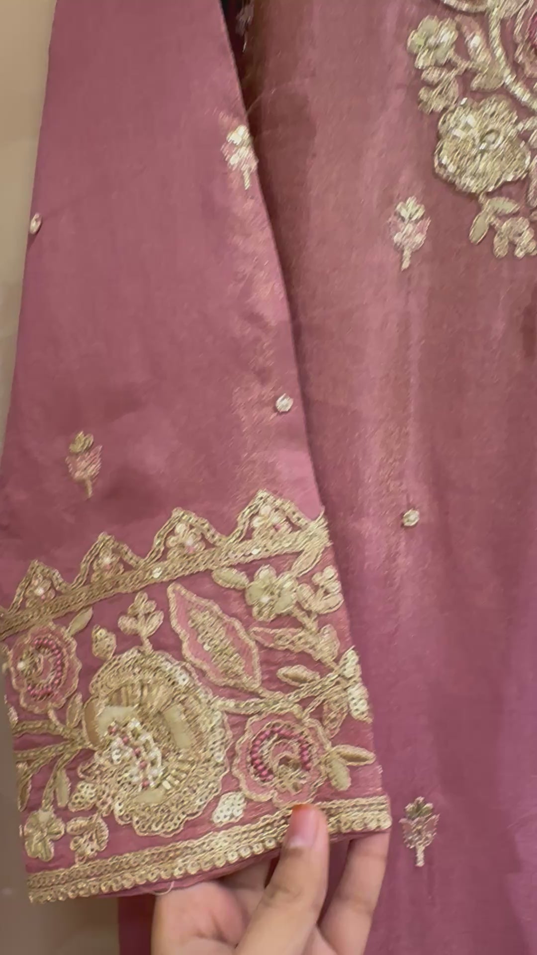 The outfit features intricate gota and hand embroidery, richly detailed on the kurta, palazzo, and dupatta ā creating a regal and refined aesthetic. The soft shimmer of the fabric paired with traditional craftsmanship makes it the perfect choice for weddings, receptions, and festive gatherings. Designed to make you feel effortlessly graceful and radiant.