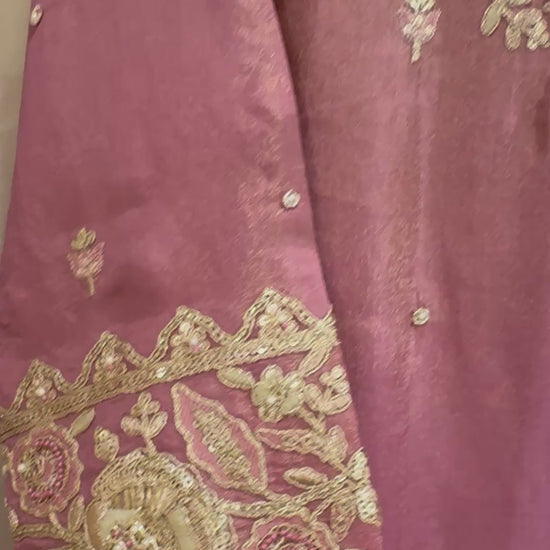 Step into timeless elegance with this Burnt Rose Pink Shimmer Tissue Palazzo Kurta Set from Inara by Javed & Daughters. Crafted from pure shimmer tissue fabric, this ensemble exudes a luxurious royal sheen that instantly elevates your festive look.