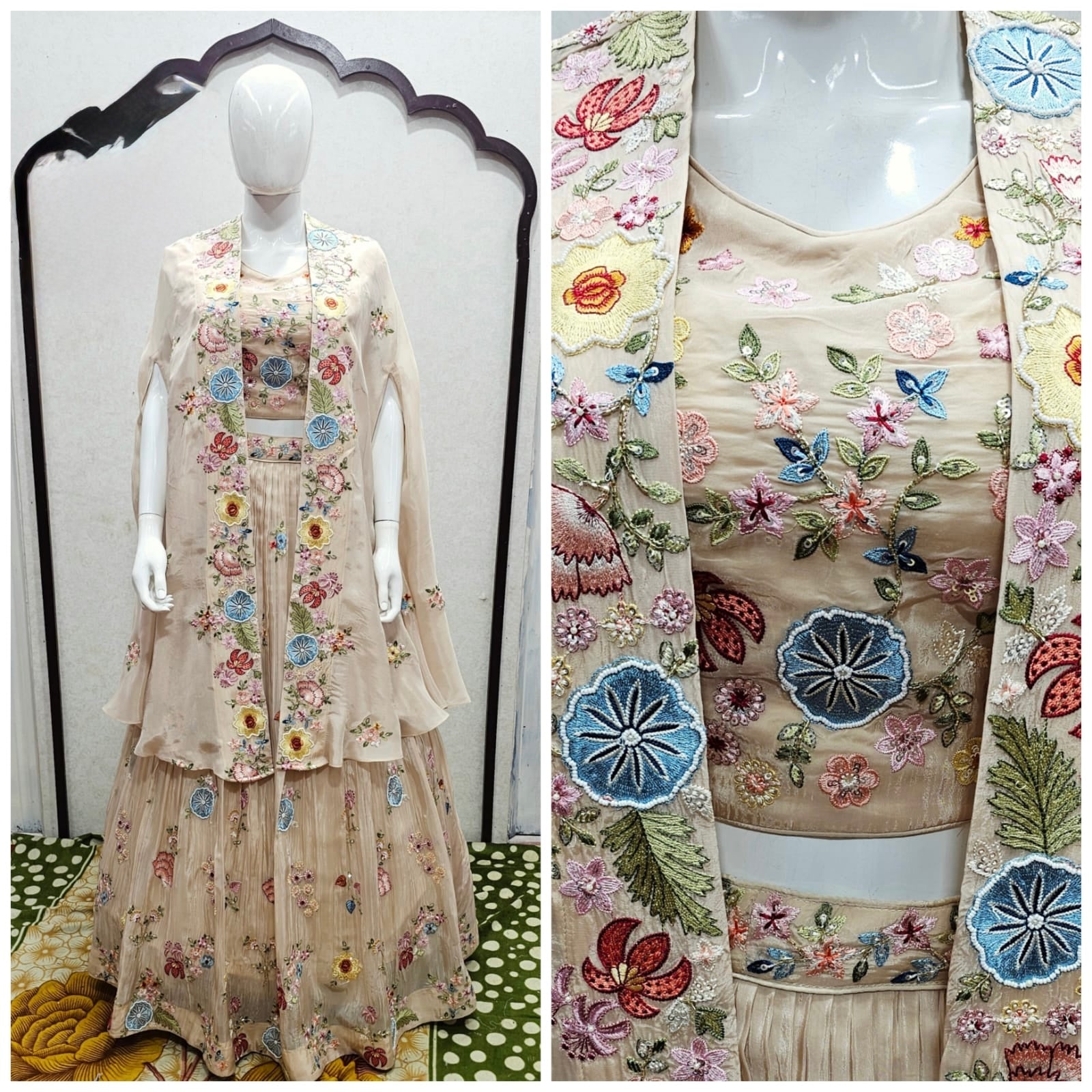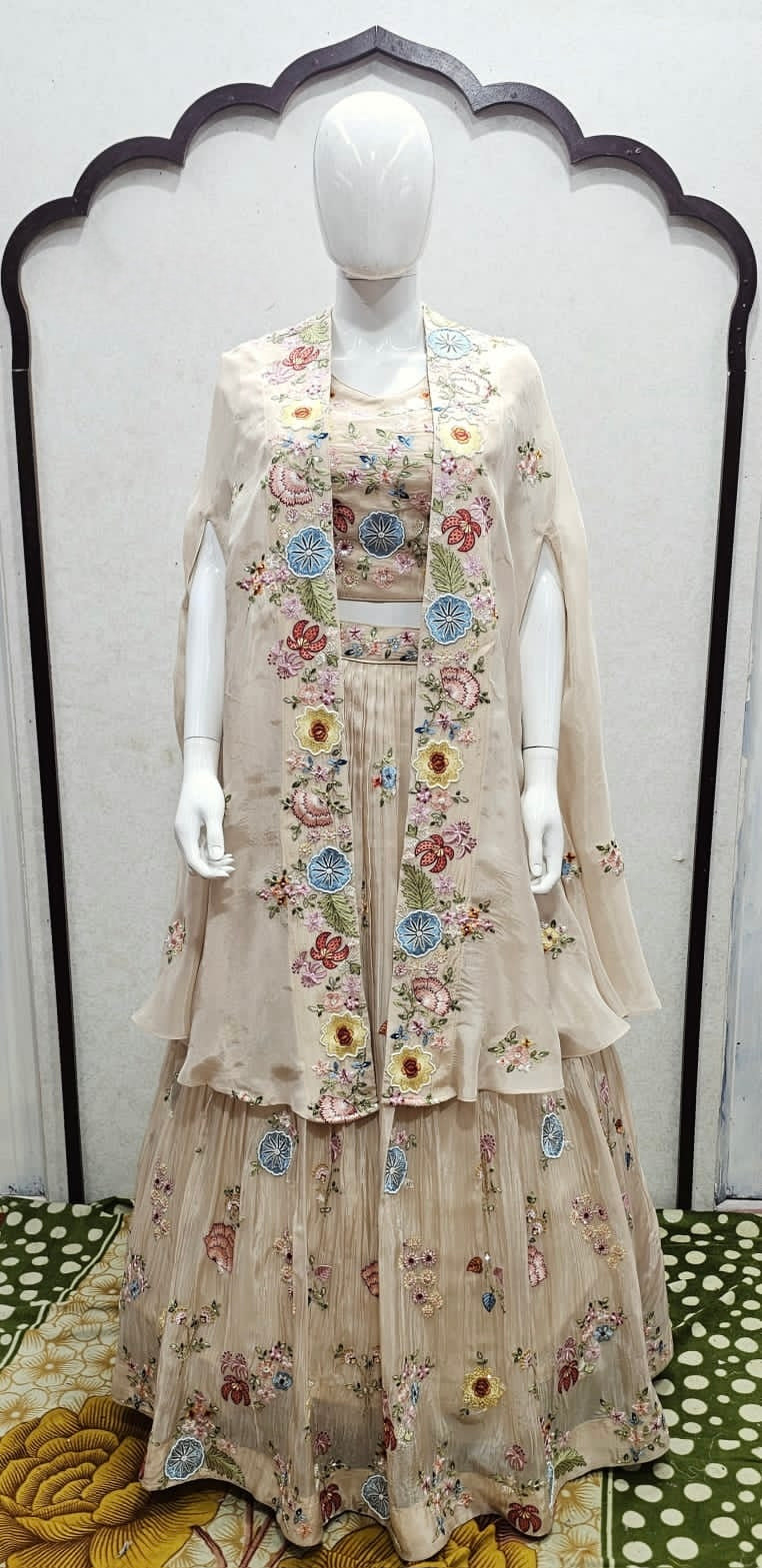 •     “Handcrafted resham embroidered lehenga with sheer cape”