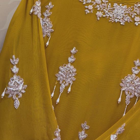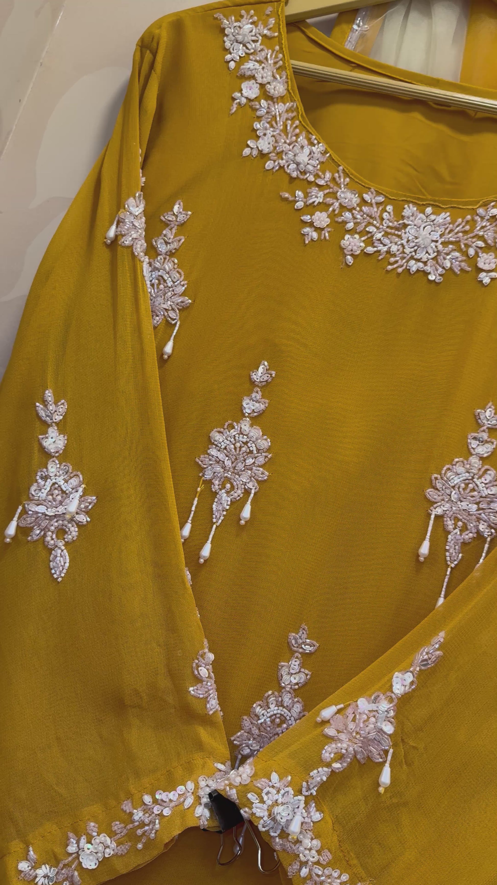 Hand-Embroidered Yellow Kurta, off white Badla Skirt & Ombre Net Dupatta”