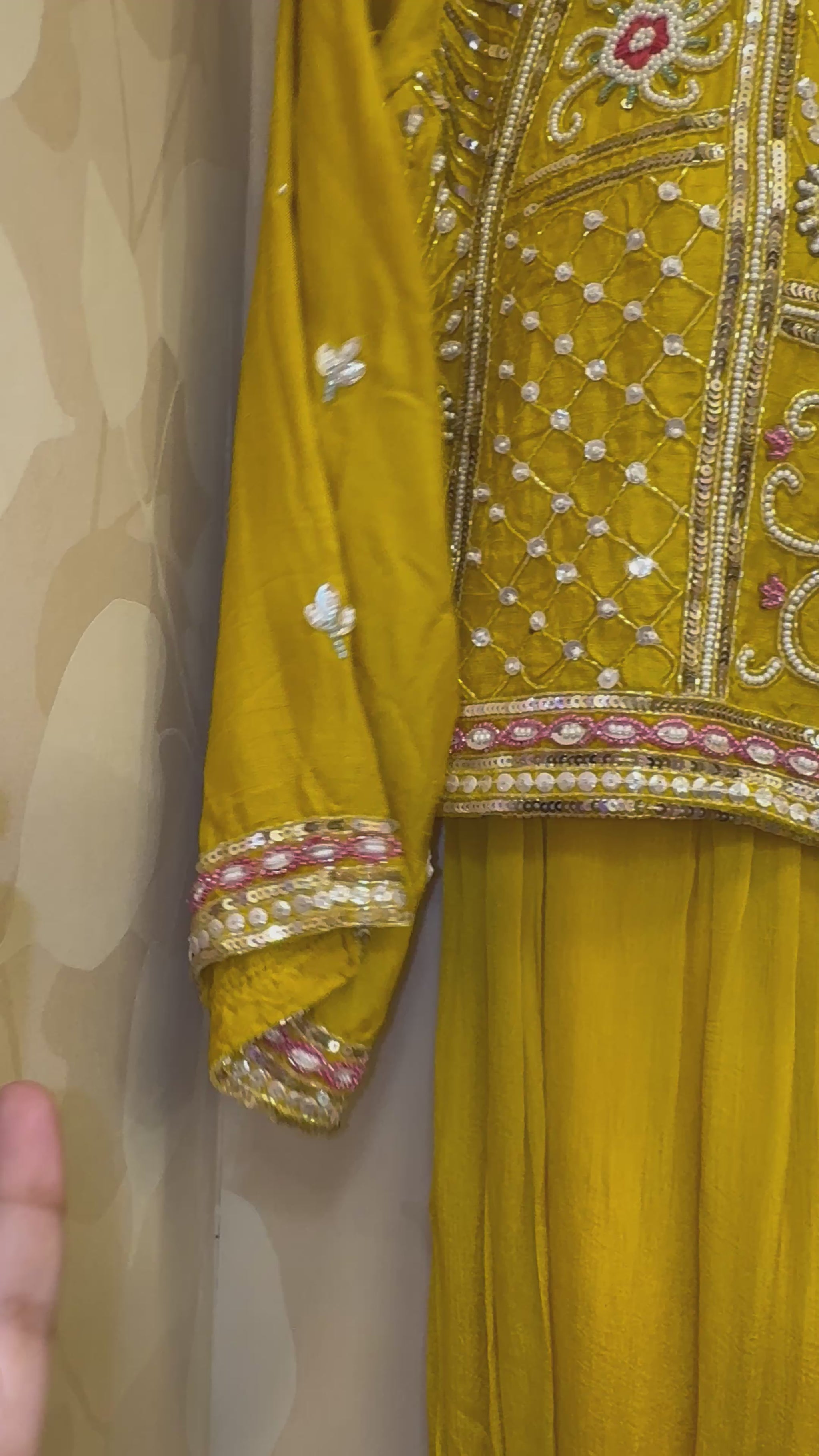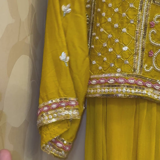 Paired with a meticulously detailed blouse adorned with mirror and thread work, this ensemble captures the essence of festive sophistication — perfect for haldi, mehendi, and intimate celebrations.