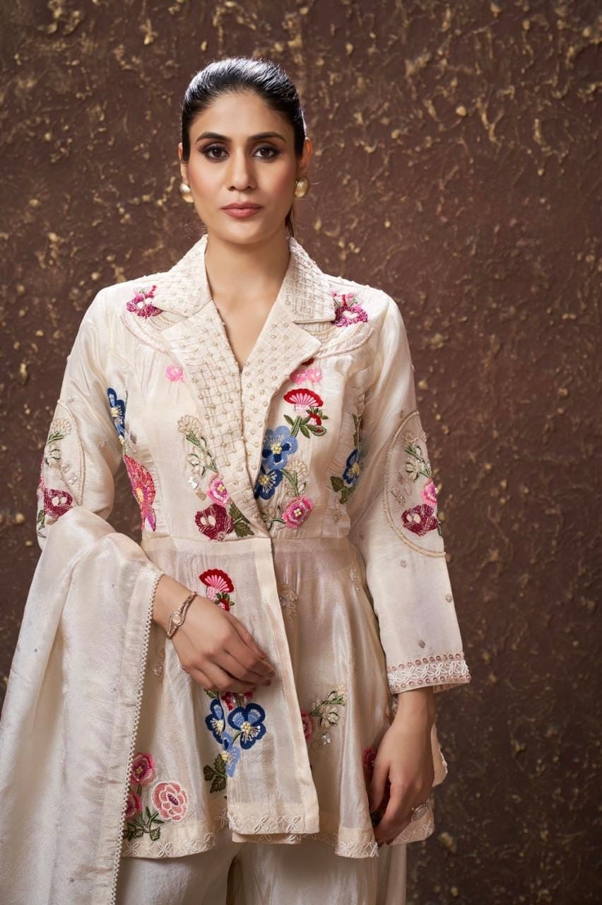 The ensemble is intricately adorned with multi-resham dhaga embroidery, enhanced with pearl detailing, cutdana highlights, and zardosi handwork, creating a rich, couture-inspired finish. Designed for the woman who appreciates contemporary silhouettes with handcrafted luxury, this outfit makes a perfect choice for festive events, sangeet nights, mehendi ceremonies, and intimate weddings.