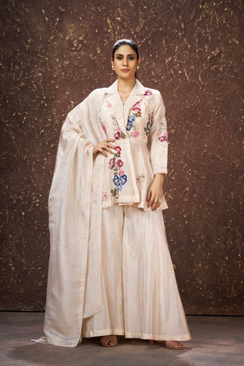 Step into festive elegance with the Aira Royale Collar Peplum Plazo Ensemble, a stunning blend of modern tailoring and traditional artistry. Crafted in premium shimmer tissue fabric and available in 6 captivating colour options, this set features a statement collar-style peplum top paired with a beautifully flared plazo and a coordinated dupatta.