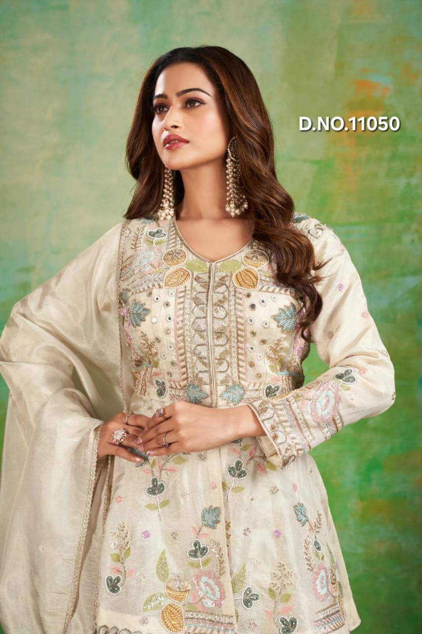 The peplum top features a sleek slit detail, elevated with intricate geometric and floral hand embroidery that adds depth and visual interest. Paired with a beautifully constructed panelled sharara, the ensemble offers fluid movement and a flattering silhouette. The combination of contemporary design and detailed handwork makes it perfect for festive celebrations, wedding functions, and special occasions.