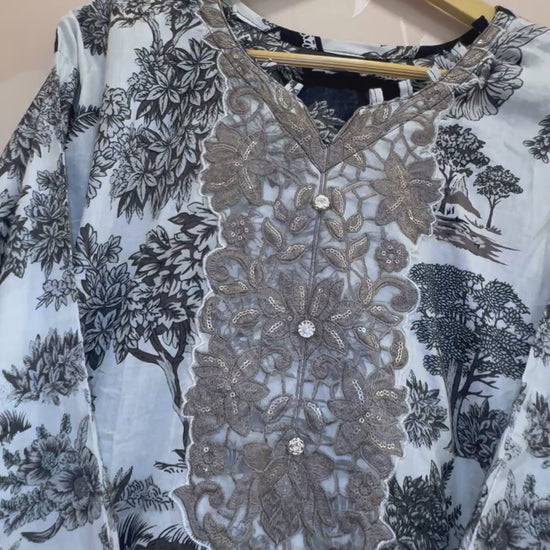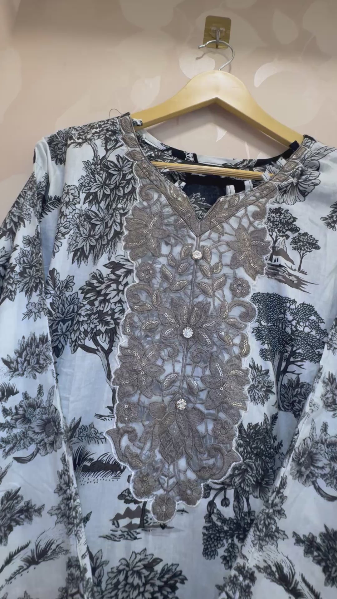 Step into effortless style with this designer lawn suit, featuring black and white digital prints accentuated with beige patchwork embroidery. Made from premium breathable lawn, it’s perfect for summer chic and all-day comfort.