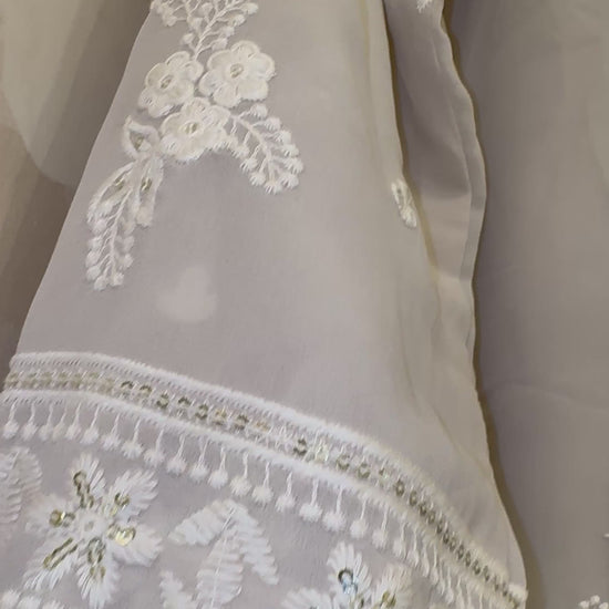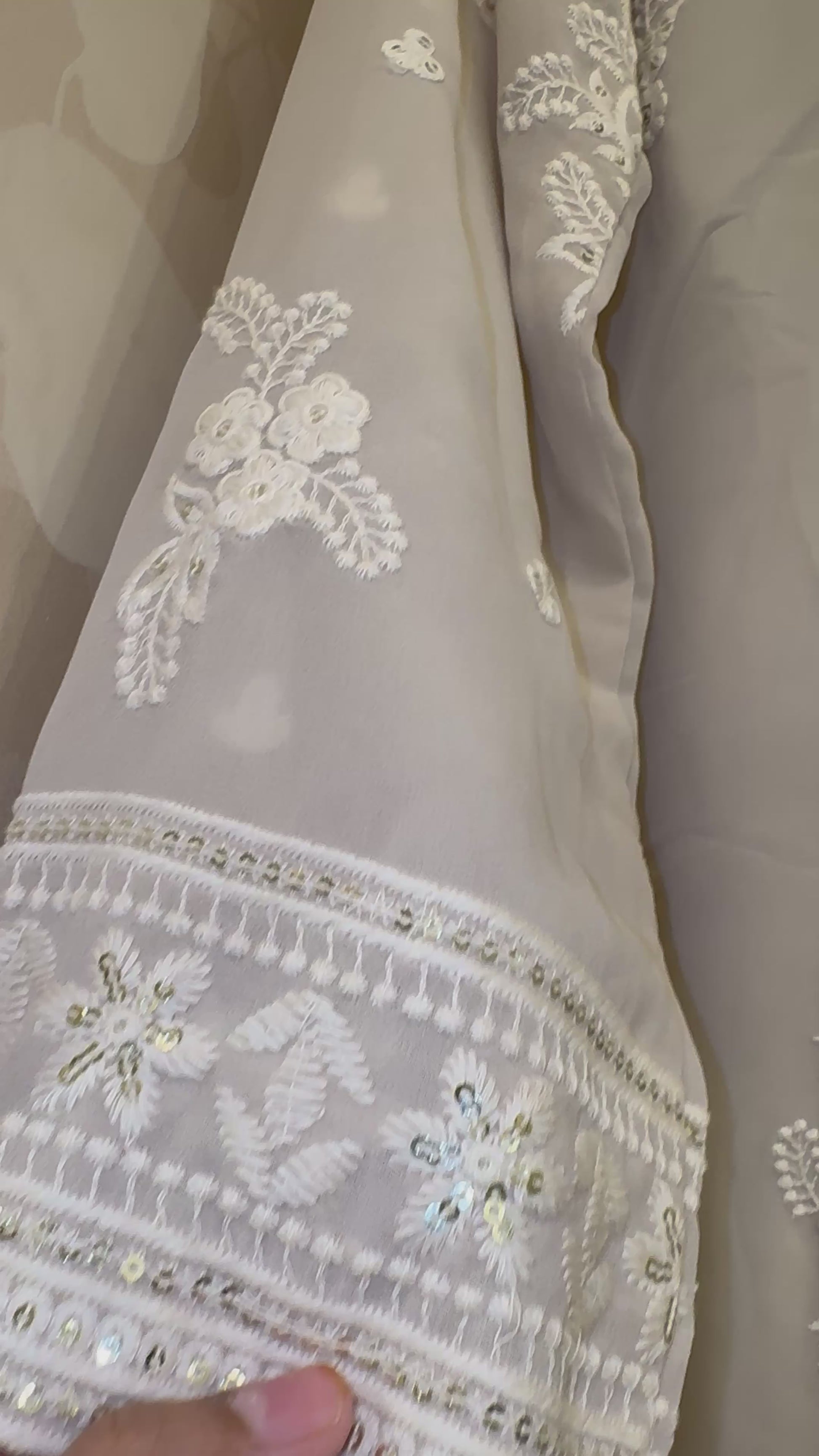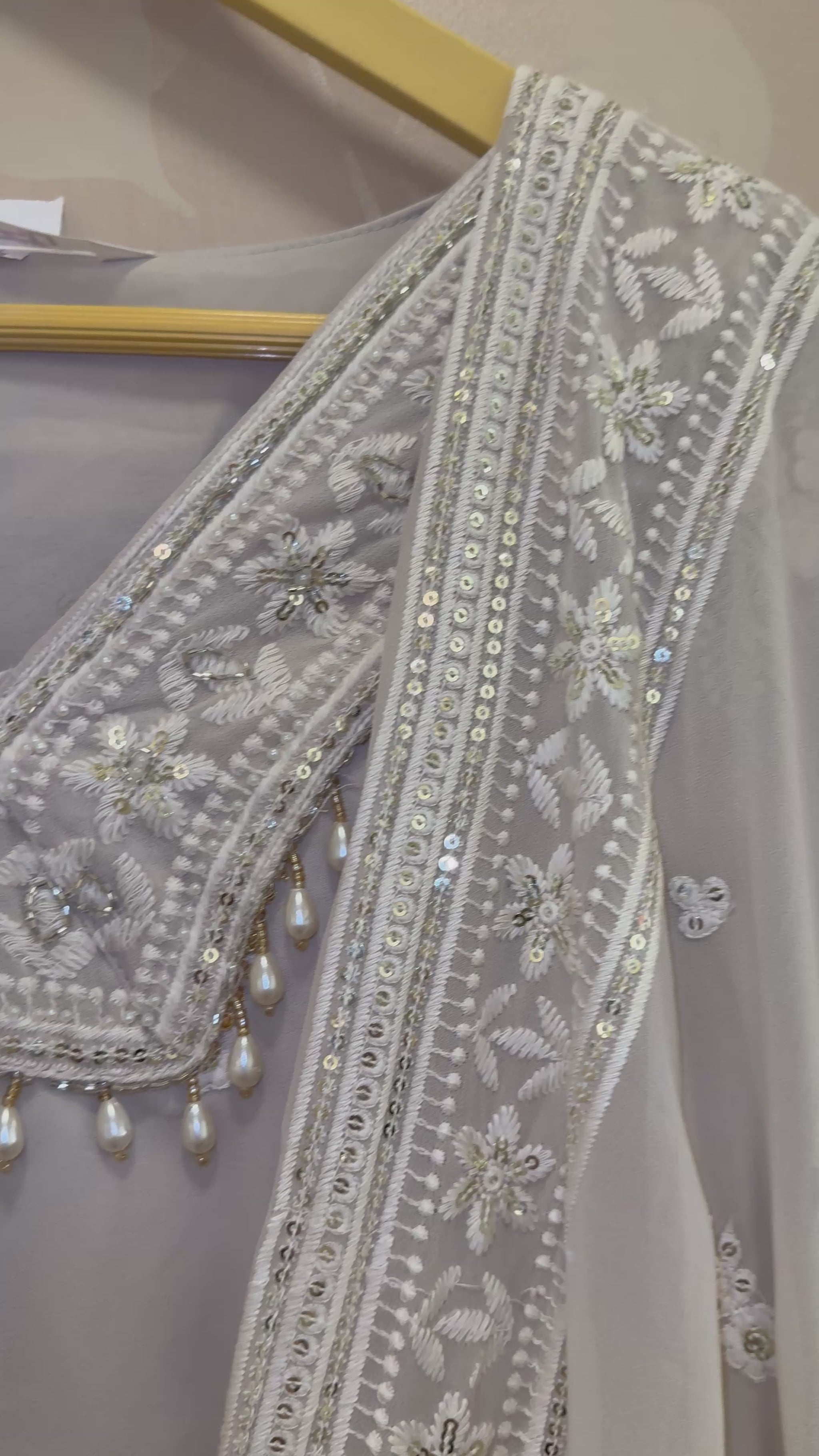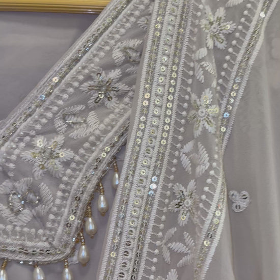Crafted in soothing beige tones, the outfit features delicate Chikankari embroidery enhanced with intricate handwork, paired with elegant co-ord pants and a matching dupatta.